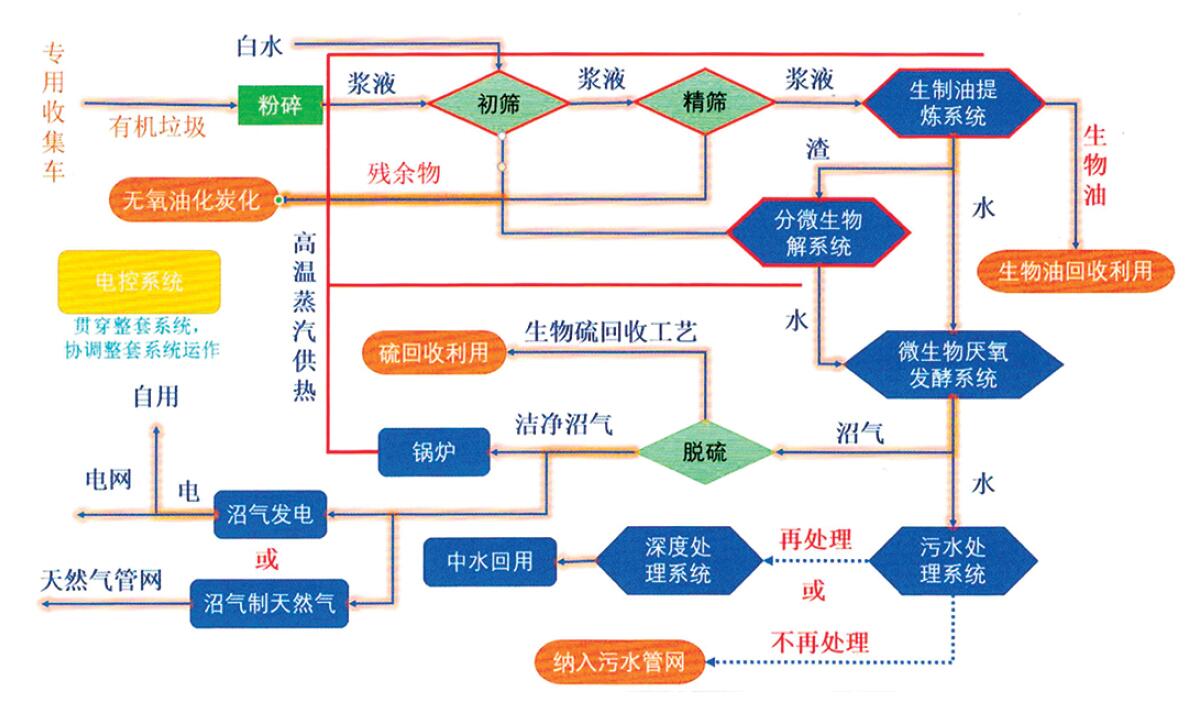 厭氧發(fā)酵產(chǎn)生的沼氣經(jīng)生物脫硫后可供給鍋爐使用,多余的沼氣可用于發(fā)電或制成天然氣,回收的油脂銷售至有資質(zhì)的企業(yè)用于加工生產(chǎn)諸如生物柴油、肥皂、增塑劑等工業(yè)產(chǎn)品,實(shí)現(xiàn)餐廚廢棄物的資源化利用。